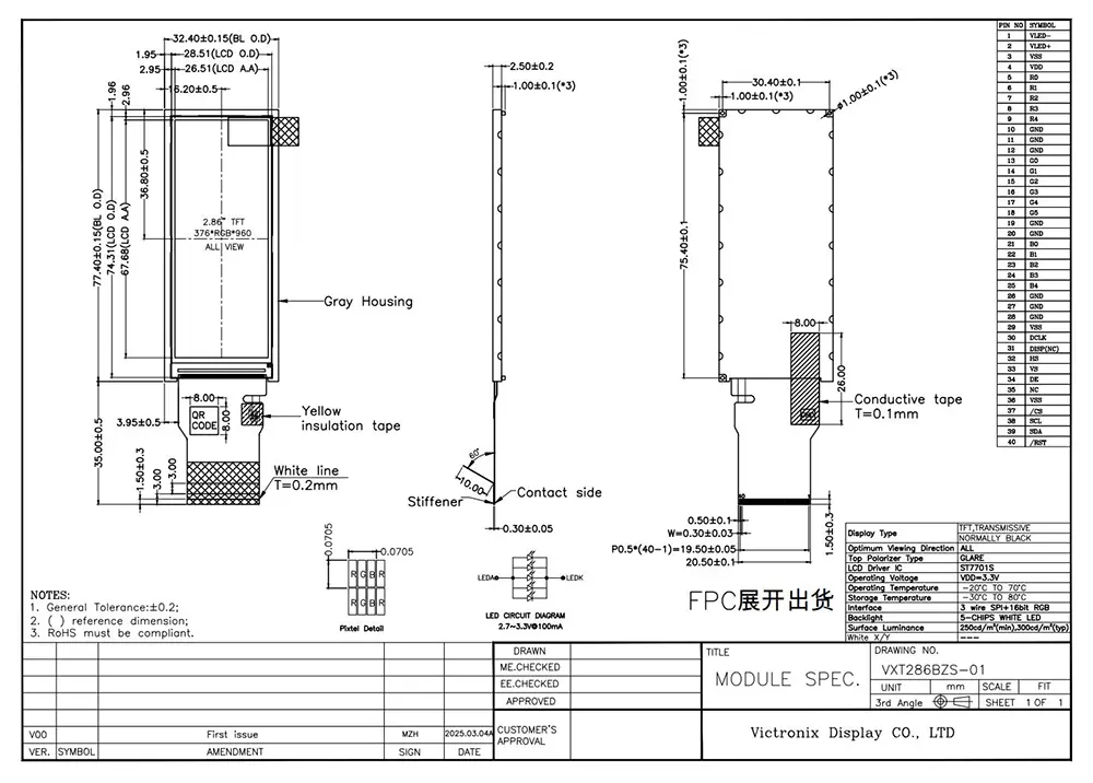 बुद्धिमत्तेच्या युगात, टीएफटी मॉड्यूल आम्हाला आवश्यक डेटा दृश्यास्पद सादर करण्यास सक्षम करते. टीएफटी मॉड्यूलच्या गुणवत्तेचा त्याच्या अनुप्रयोगावर गंभीर परिणाम होतो. व्हिक्ट्रॉनिक्स 2.86 इंच 376 × 960 आयपीएस टीएफटी मॉड्यूलचे फायदे काय आहेत? प्रथम, त्याची 300 सीडी/एमए ब्राइटनेस, 1500: 1 कॉन्ट्रास्ट रेशो, सर्व दिशानिर्देशांमध्ये 85 डिग्री व्ह्यूइंग कोन आणि 80% एकरूपता ज्वलंत प्रतिमा सुनिश्चित करते. दुसरे म्हणजे, हे एसटी 7701 एस सह एसपीआय+16 बीट आरजीबी इंटरफेसचे समर्थन करते, आणि 5-डाय-व्हाईट एलईडी बॅकलाइटसह 30,000 ते 50,000 तास आयुष्यभर विविध औद्योगिक अनुप्रयोगांमध्ये त्याची दीर्घकालीन उपयोगिता सुनिश्चित करते. याव्यतिरिक्त, हे आरओएचएसच्या मानकांचे पालन करते आणि 8 केव्ही एअर आणि 4 केव्ही संपर्कापर्यंत थर्मल शॉक, आर्द्रता आणि ईएसडी संरक्षणासह कठोर विश्वसनीयता चाचण्या यशस्वीरित्या पास करते. हे उत्पादन -20 डिग्री सेल्सियस ते +70 डिग्री सेल्सियस पर्यंतच्या अत्यंत तापमानात कार्यक्षमतेने कार्य करते आणि -30 डिग्री सेल्सियस ते +80 डिग्री सेल्सियस पर्यंत गंभीर स्टोरेज परिस्थितीचा सामना करू शकते.