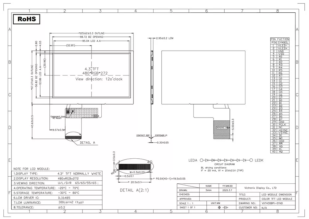 हे व्हिक्ट्रॉनिक्स 3.3 इंच 480 × 272 औद्योगिक टीएफटी मॉड्यूल एक उच्च-कार्यक्षमता 4.3 इंच टीएफटी-एलसीडी मॉड्यूल आहे जो मजबूत आणि अष्टपैलू औद्योगिक अनुप्रयोगांसाठी डिझाइन केलेला आहे. एक तीव्र 480 × 272 रिझोल्यूशन आणि 16.7 दशलक्ष रंगांपर्यंत समर्थन देणारी, हे मानक आरजीबी इंटरफेसद्वारे दोलायमान आणि तपशीलवार व्हिज्युअल आउटपुट वितरीत करते. आयएलआय 6485 सीरिज कंट्रोलरद्वारे चालविलेले, मॉड्यूल 12 वाजण्याच्या दिशेने 65 of चे विस्तृत दृश्य कोन ऑफर करते, 700: 1 चे उच्च कॉन्ट्रास्ट प्रमाण आणि 20 एमएसचा वेगवान प्रतिसाद वेळ, डायनॅमिक डिस्प्ले परिस्थितींमध्ये गुळगुळीत कामगिरी सुनिश्चित करते. चीनमधील टीएफटी मॉड्यूल्सचे व्यावसायिक निर्माता आणि पुरवठादार म्हणून, हे व्हिक्ट्रोनिक्स 3.3 इंच टीएफटी मॉड्यूल आरओएचएस पर्यावरणीय मानकांचे पूर्णपणे अनुपालन आहे, जे अनुप्रयोगाची उत्कृष्ट कामगिरी सुनिश्चित करते. आम्ही आमच्या ग्राहकांच्या गरजा भागविण्यासाठी सानुकूलित सेवा ऑफर करतो.